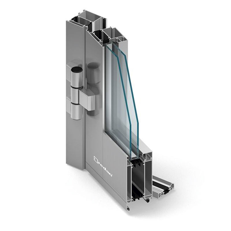 Darüber hinaus beträgt die Einbautiefe von Türprofilen sowohl für den Flügel als auch für den Rahmen 70 mm, wodurch der Effekt bündiger Profiloberflächen erzielt werden kann, was eine schlanke und gleichzeitig starke Konstruktion ermöglicht. Es gibt auch Dehnungsprofile für die Türflügel, mit denen man das thermische Phänomen, das Biegen von großen Flügeln, vermeiden kann. Im System wurden auch profilierte Omega-förmige thermische Trennzwischenlagen mit einer Breite von 24 mm (aus glasfaserverstärktem Polyamid) eingesetzt.